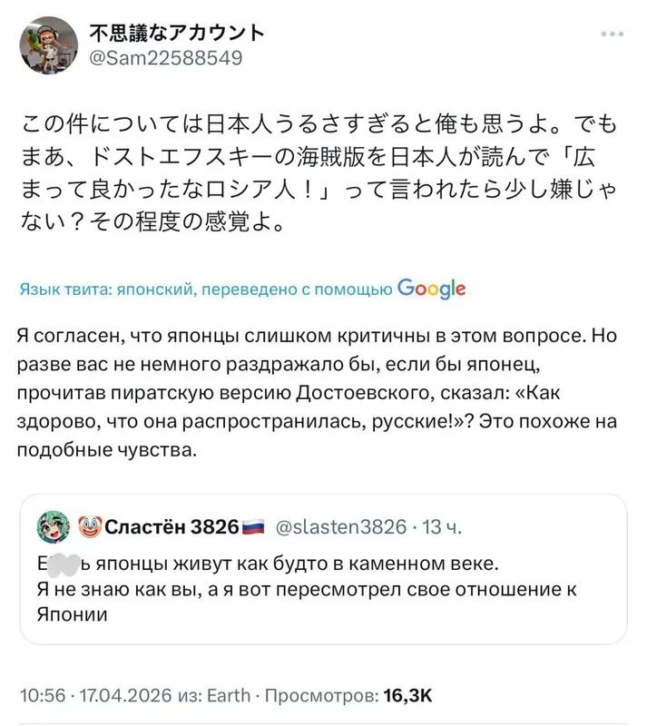 Узнал, что в очередном сраче между японцами и русскими на тему пиратсва аниме/манги, японец выдал такое. Наверное его мир после этого не будет прежним. Показать ещё