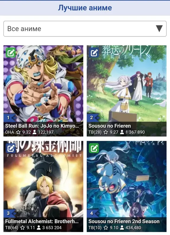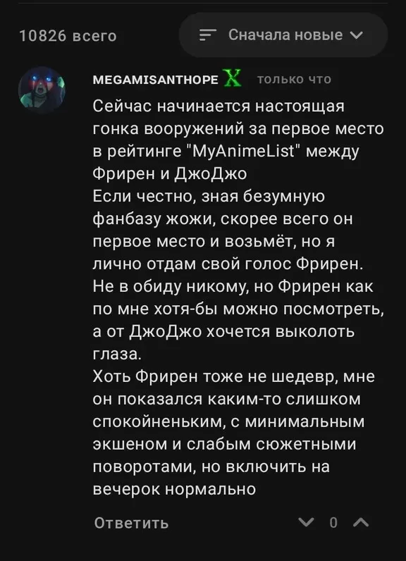 Фанаты ДжоДжо опустили оценку второму сезону Фрирен до 9.10, тем самым сместив его ниже по топу. Так что в битве фанатов Джоджо и Фрирен побеждают фанаты Стального Алхимика. Показать ещё