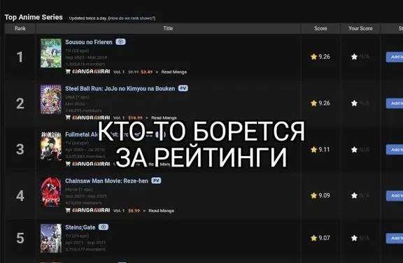 Фанаты ДжоДжо опустили оценку второму сезону Фрирен до 9.10, тем самым сместив его ниже по топу. Так что в битве фанатов Джоджо и Фрирен побеждают фанаты Стального Алхимика.
