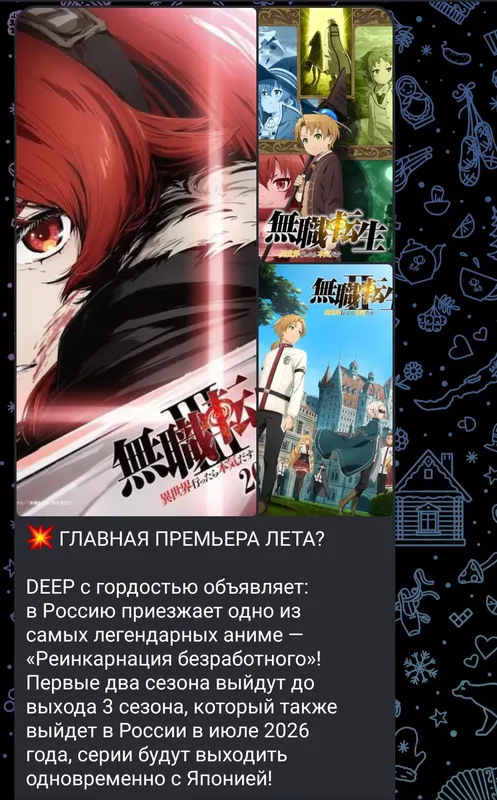 Тем временем наш всеми любимый Евгений Краснов (Бородач, директор по контенту и локазизации Deep) и дальше лицензирует свои любимые тайтлы. Новой жертвой стало аниме "Реинкарнация безработного"Интересно, что ему приглянулась в этих двух тайтлах? Пишите свои варианты в комментариях