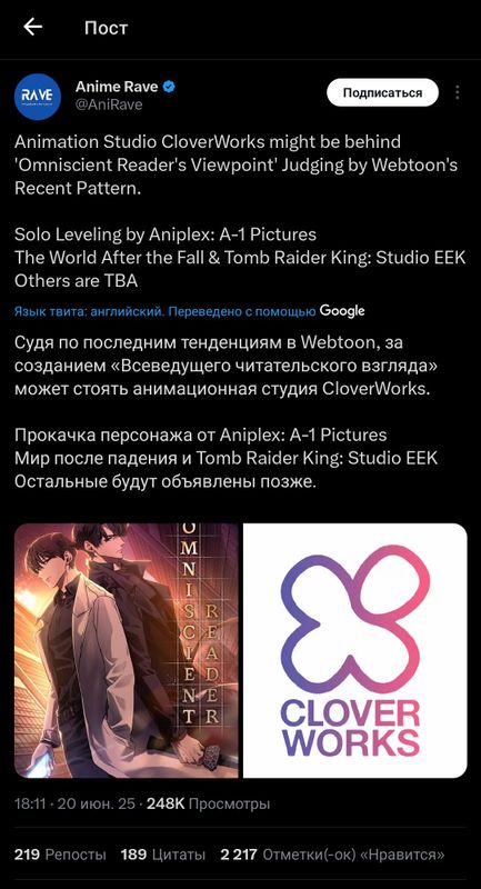 Есть не подтверждённая информация что аниме адаптацию новеллы будет делать студия CloverWorks и автор новеллы будет сам участвовать в адаптации аниме.Дополнительно аниме адаптации новеллы "Мир после разрушения" тоже от автора "Всеведущий Читатель" будет делать корейская студия STUDIO EEK.Мир после разрушения и Всеведущий Читатель это одна вселенная но события прохядт в разных местах.Напомню что корейская власть проспонисровали аниме индустрию после того как СолоЛевелинг стал "хитом" в аниме и где-то пару десяток манхв получат аниме адаптацию.