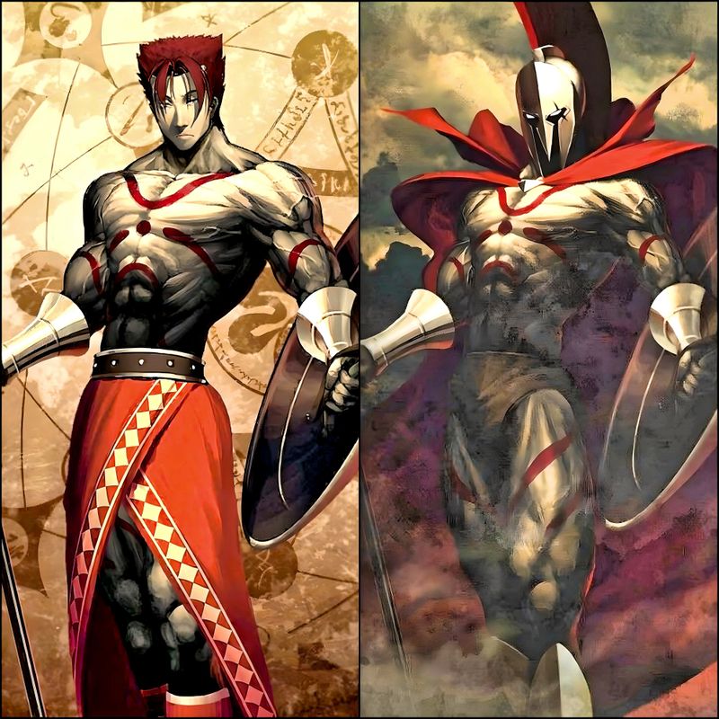 Одно из двух главных разочарований в тайтле «Повесть о конце света» - дизайн и персонаж Короля Спарты Леонида I. Почти все фанаты это захейтили, потому что вместо Героя Спарты получили Прапорщика Лёню. Справа тот же Леонидас, но из «Судьбы/великого приказа» - вот у кого дизайн соответствует.