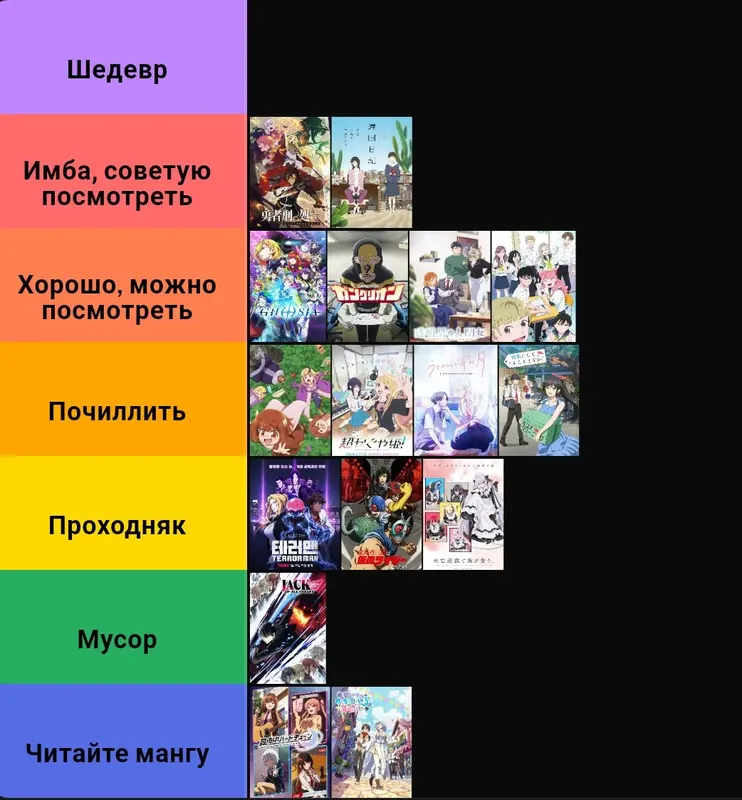 В остальном, тут почти все тайтлы сезона кроме гаремников и пары слишком херовых исекаев. Надежд на то что хоть одно аниме получит 5/5 нет, но если кто-то и сможет то думаю что-то из этих:«Гносия», «17-26 Фудзимото», «Один танец» и «Звезда ярче солнца».
