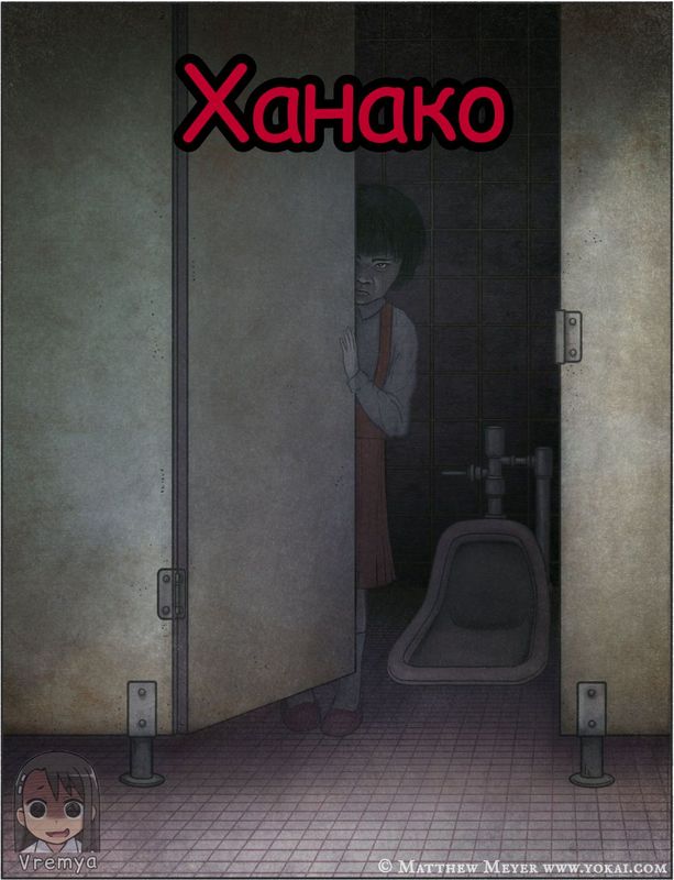 Ханако - дух юной школьницы, которая встретила свой конец в туалете начальной школы в результате то ли самоубийства из-за издевательств. Многие дети проверяют свою смелость, вызывая дух девочки. Чтобы позвать её, надо зайти в туалет на третьем этаже и трижды постучать в третью кабинку, а затем спросить: “Ты здесь, Ханако-сан?” Если вы услышите тихий ответ, поспешно уходите. Если же будете медлить или решите войти в кабинку, Ханако затащит вас в туалет, и вас больше никогда не увидят!