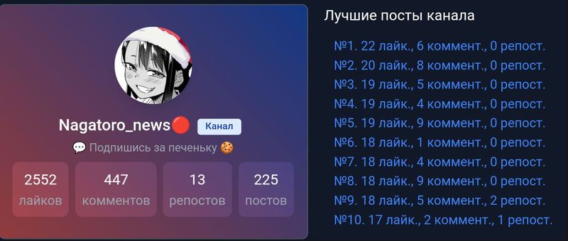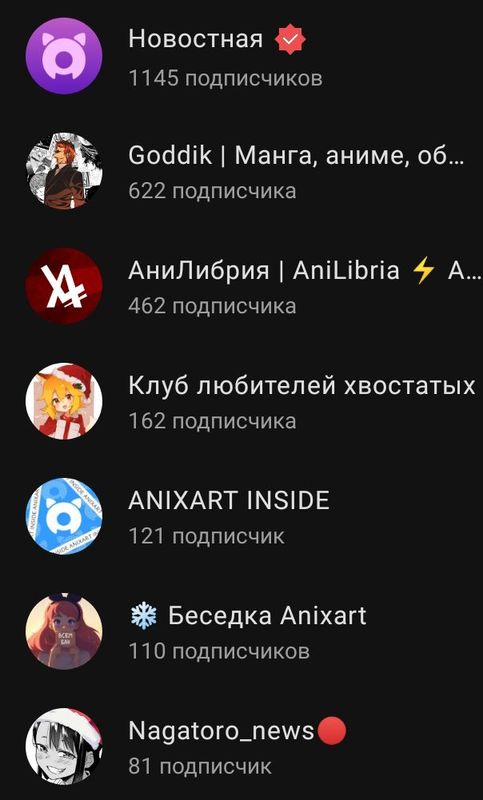 Мы попали в топ 20 каналов в anixart. Спасибо вам большое что подписываетесь на мой канал и активно лайкаете посты, я вам очень благодарен, с каждым новым человеком во мне появляется всё больше сил и идей, делать новые, а главное интересные посты. Вы у меня самые лучшие ❤