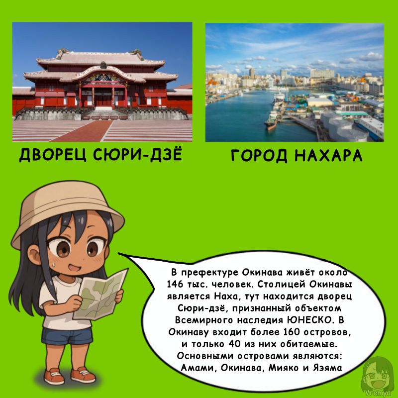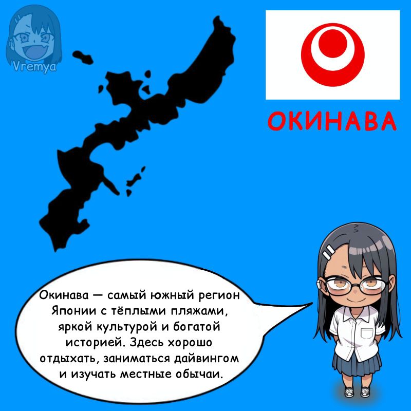 💬 Префектура ОкинаваХотите расскажу про остальные префектуры?Прошлые посты про префектуры:• Прифектура Мияги• Прифектура Хокайдо+7Источники:• Нейросеть - GigaChat• Нейросеть - Chat GPT• Сайт - Википедия#Окинава #Префектура #Япония #Нагаторо #Еда #Население #Культура #Диалект #Жители #Фестивали #Животные #Рыбы #Климат #Традиции #Фольклор #Nagatoro_news #Vremya50expand_more18expand_less