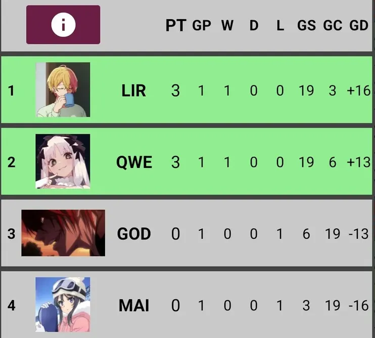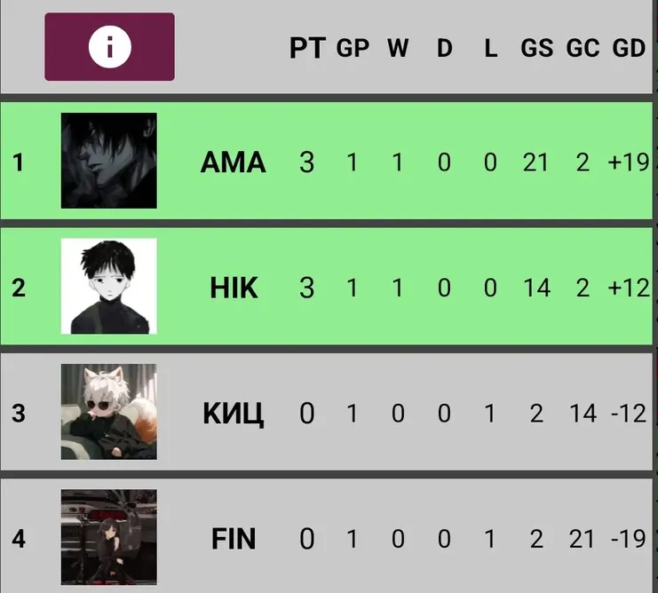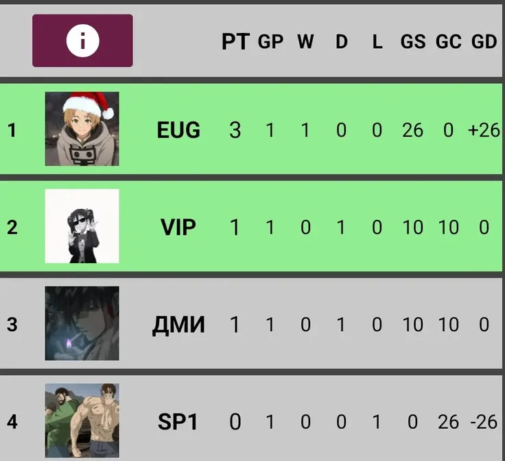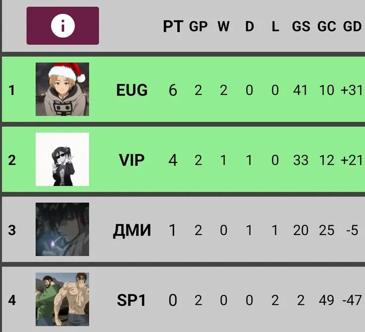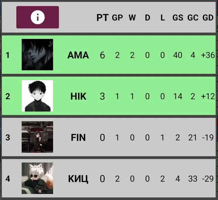 Группа С завершёна:Eugene63 и vip_Nip проходят дальше в 1/8 финала! 🥳 Дмитрий_Сенпай и Sp1tFffire покидают турнир 🥲 Спасибо им за участие 🫂пояснение: как можете заметить у vip_Nip и Дмитрий_Сенпай одинаковое кол-во очков и даже GD (Goal Difference)!! В таком редком случае выше будет тот - кто больше получил голосов за все матчи. В итоге: vip_Nip (52) Дмитрий_Сенпай (43)