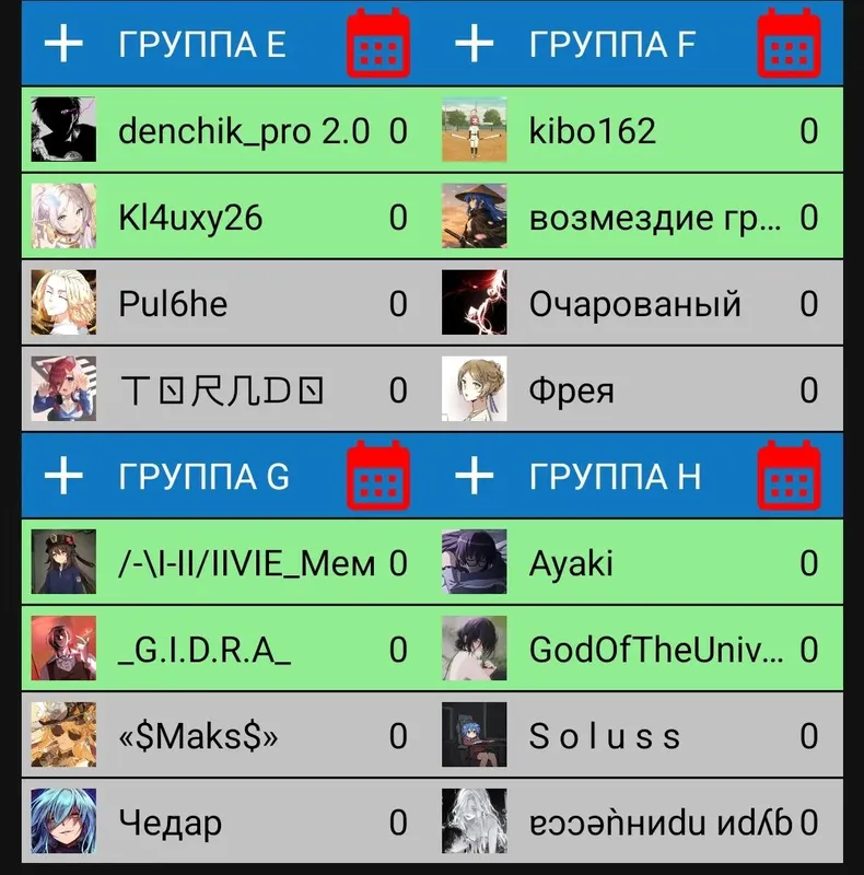 p.s всем добрый вечер как всегда 👋🏻 по этому туру могу сказать что он вышел довольно прикольным, за равной битвой Димы и Евгена бы прикольно наблюдать, но в итоге Евген дожал. Но а наш турнир движется к экватору! уже завтра кончается группа С, а после, следующим днём кончится группа D, и официально экватор будет достигнут. (естественно это только половина группового этапа а не самого турнира)Напомню вам как выглядят группы второй части: